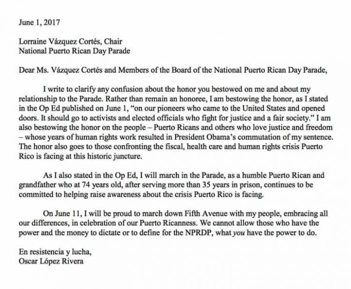 After López Rivera’s text was published by the Daily News on Thursday, the National Puerto Rican Day Parade’s Board of Directors shared the following statement with media: “We are looking forward to marching with Oscar López Rivera and respect his decision to walk up Fifth Avenue, ‘not as an honoree but as a humble Puerto Rican and grandfather.’ Now we can focus again on important issues and the plight of Puerto Rico.”