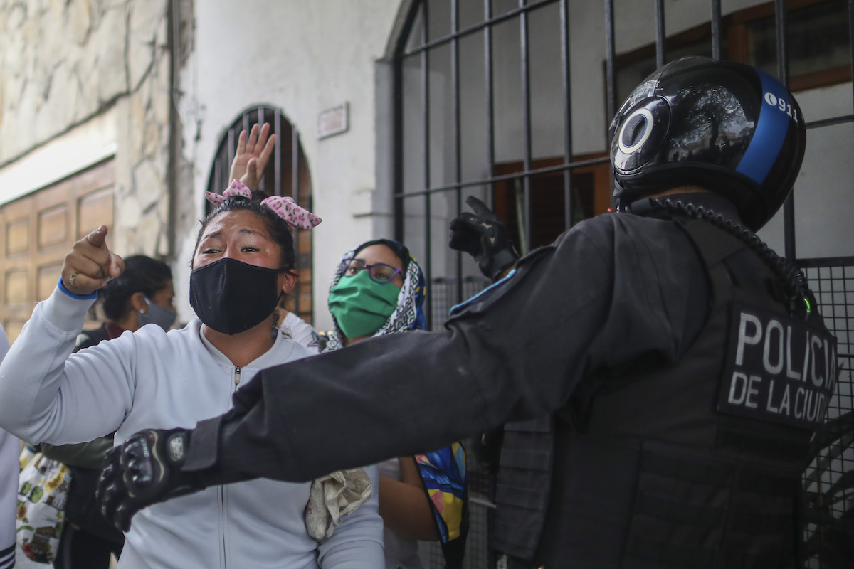 Relatives of inmates gather outside the Villa Devoto prison in Buenos Aires, Argentina, Friday, April 24, 2020. Riots broke out inside the prison as inmates protest that authorities are not doing enough to prevent the spread of coronavirus inside the prison. (AP Photo/Natacha Pisarenko)