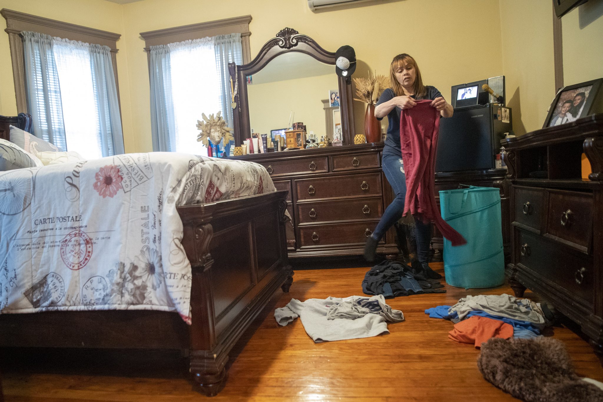 In this Monday, April 27, 2020 photo, Lissette Serrano sorts her laundry while doing her daily chores at home in Bridgeport, Connecticut, after being let go from her job as a cleaner at a rest stop on the Merritt Parkway in Orange, Connecticut. (AP Photo/Mary Altaffer)