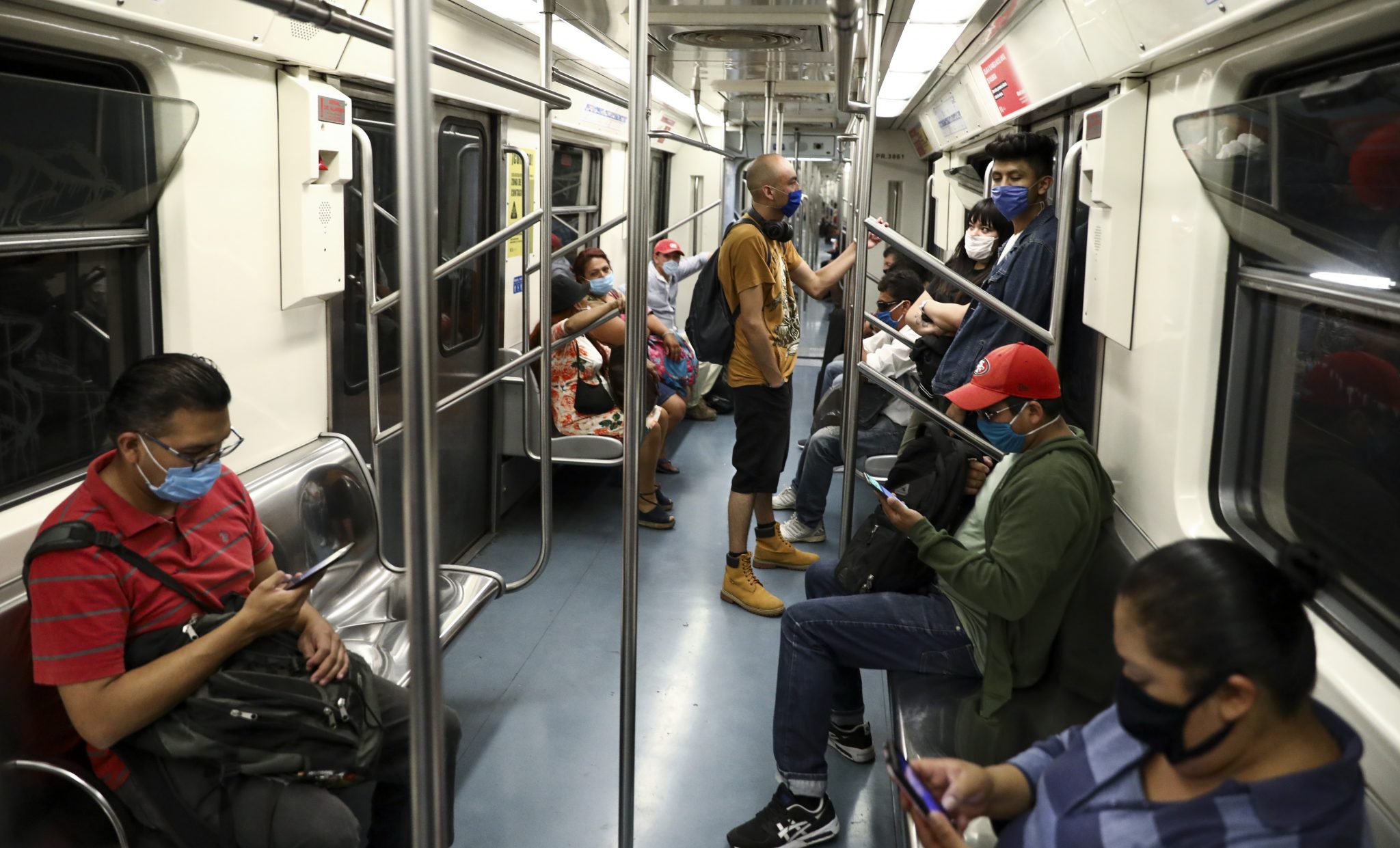 Commuters wearing masks against the spread of the new coronavirus ride the subway in Mexico City, Thursday, May 14, 2020. (AP Photo/Eduardo Verdugo)