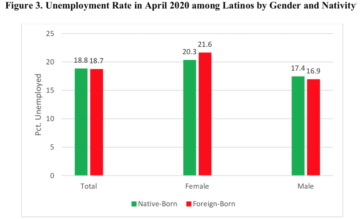Unemployment rates are fairly similar across native-born and foreign-born Latinos as a whole (Figure 3). Still, immigrant women fare slightly worse than U.S.-born Latinas while immigrant men are a bit better off than their native-born Latinos. Nearly 22% of Latina immigrants were without a job last month.